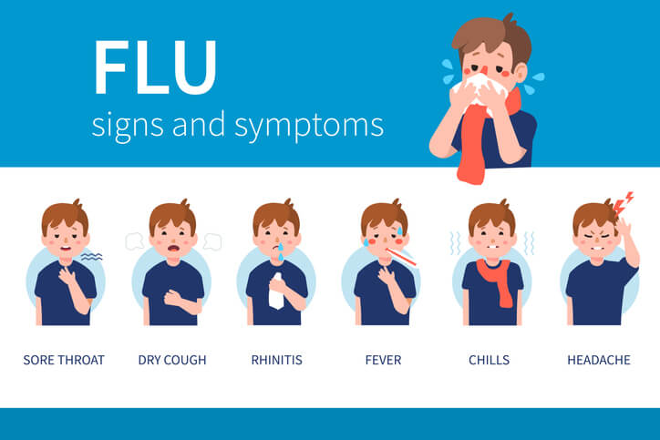Influenza is a viral infection that spreads easily through respiratory droplets (e.g. coughing, sneezing, talking). As a result, symptoms often come on suddenly and may include: